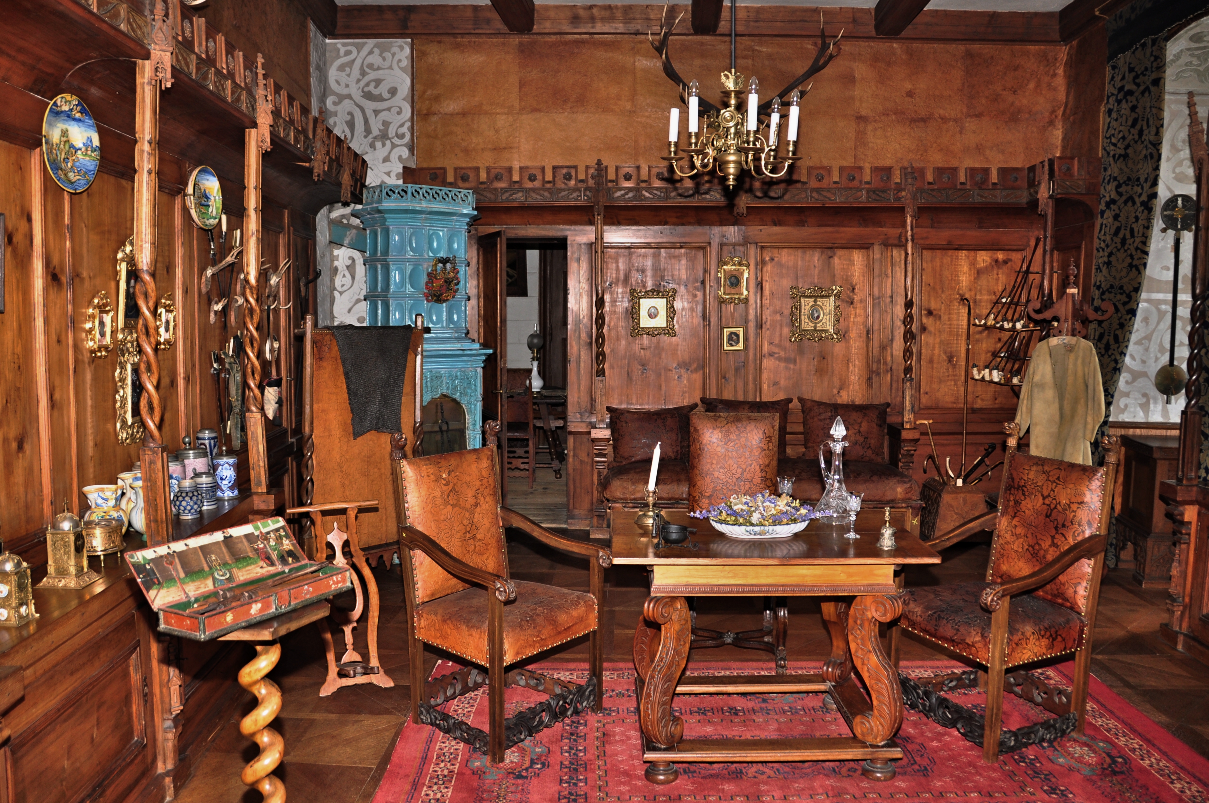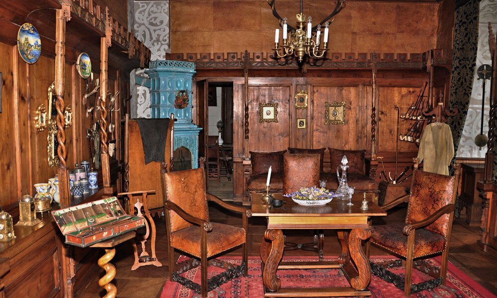 Reprezentační salóny východního i jižního křídla horního zámku, zámecká zbrojnice s ojedinělou sbírkou zbraní a zbroje, romantické interiéry, renesanční arkádové nádvoří s ochozy, zámecká kuchyně s historickým provozním zázemím a přípravnou jídel.